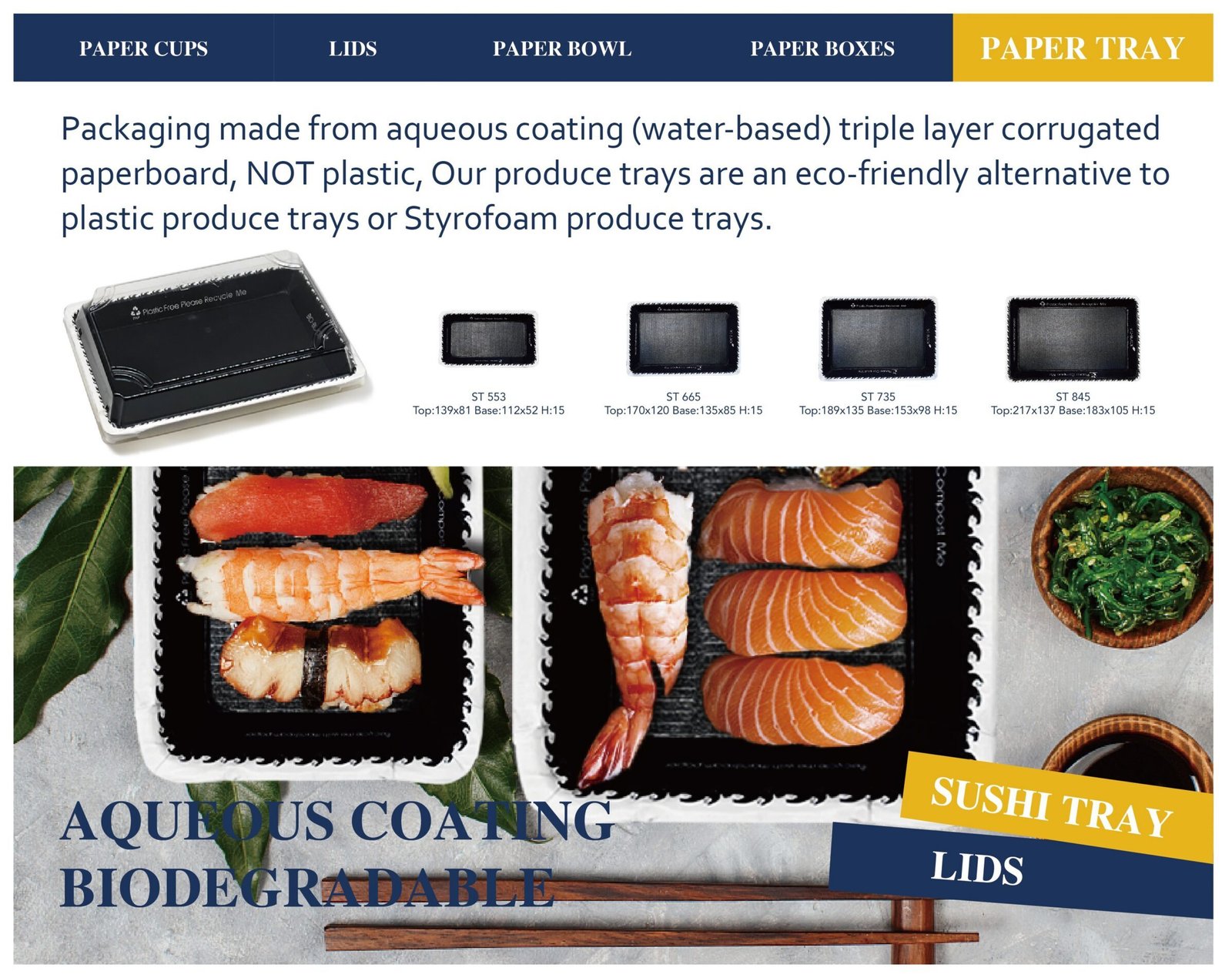 Crafted from high-quality paper with food-grade coatings, these trays are fully compostable, recyclable, and biodegradable, making them an excellent alternative to plastic and foam packaging. The trays are available in various sizes to accommodate different food portions, and they come with matching lids for complete packaging solutions.